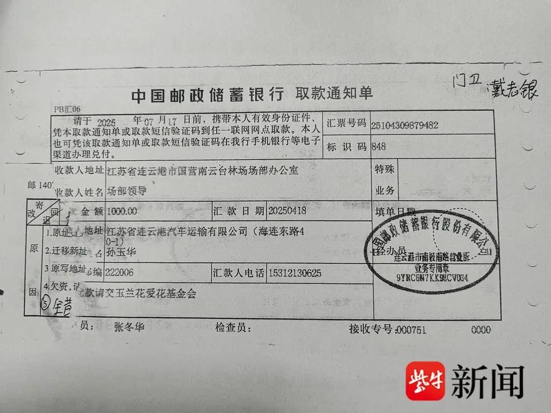 记者看到取款通知单上的汇款人为“孙玉华”,工作单位是“江苏省连云港汽车运输有限公司”,联系方式是一个手机号码。当记者多次拨打取款单上的手机号码时,电话虽然接通了,但始终处于无人接听状态。