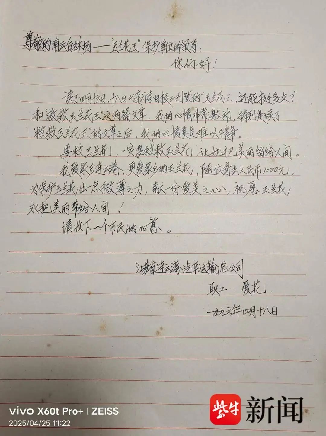 1996年4月18日,她给南云台林场场部写下第一封信:“读了4月16日、18日连云港日报刊登的《玉兰花王,还能挺多久?》和《救救玉兰花王》这两篇文章,我的心情非常激动,特别是读了《救救玉兰花王》的文章之后,我的心情更是难以平静。一定要救救玉兰花,让她把美丽留给人间,我爱家乡连云港;更爱家乡的玉兰花。随信寄去人民币1000元,为保护玉兰花出一点微薄之力,献一份爱美之心!”